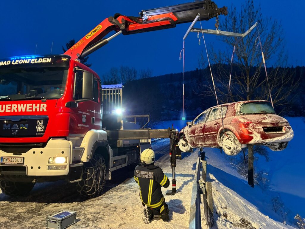 Am Freitagmorgen kam ein PKW in der Kamplmühle von der Schneefahrbahn ab und stürzte über eine Böschung. Der Fahrzeuglenker wurde vom Roten Kreuz erstversorgt und der PKW musste mittels Last-Kranfahrzeug der Feuerwehr Bad Leonfelden geborgen werden. Der Einsatz dauerte in Summe eineinhalb Stunden.